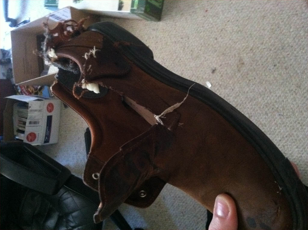 What sucks right now was that as of this morning, even my backup pair of shoes has a hole in it – dress shoes, as you can see, are pretty much toast, but about a week ago she got a hold of one of my tennis shoes and chewed a hole in the toe, which so far I’ve just been wearing anyways because it’s been at night when there’s no one but me to know about the hole, anyways. I do have to make more of a conscious effort to avoid puddles, though.