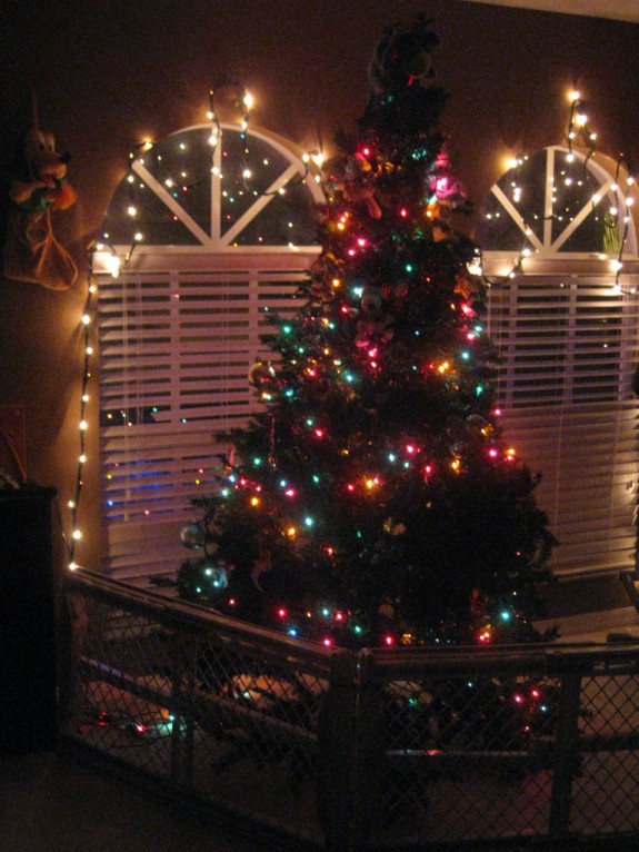 Finally got the tree up the other night after having its tattered box sitting in the middle of the family room for the better part of a week! We still had to put up the same Christmas Tree Protection Shield which we erected last year to keep Cleo at bay, on account of her attempting to use it as a back-scratcher within about 5 minutes of it being up, but I think it turned out well and it’s kinda nice that it can also be a part of our greater light display outside through the front window. 😉