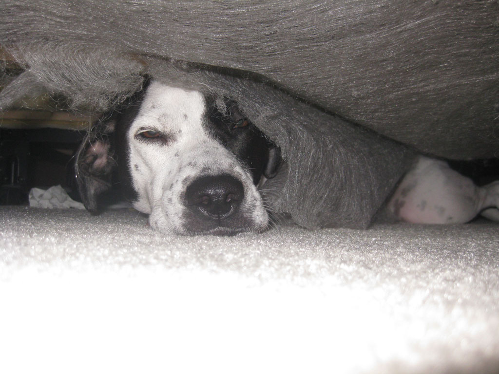 Instead of a thoughtful and also practical gift beneath the bed, though, all I found was a tattered pack of travel Kleenex that she had stolen a while back and had apparently stashed under the bed to enjoy when the rest of us were otherwise occupied. You can tell from the photo that she wasn’t too thrilled of me discovering her secret hiding place, or of the flash on the camera that I had to use to get a photo under the otherwise dark bed.
