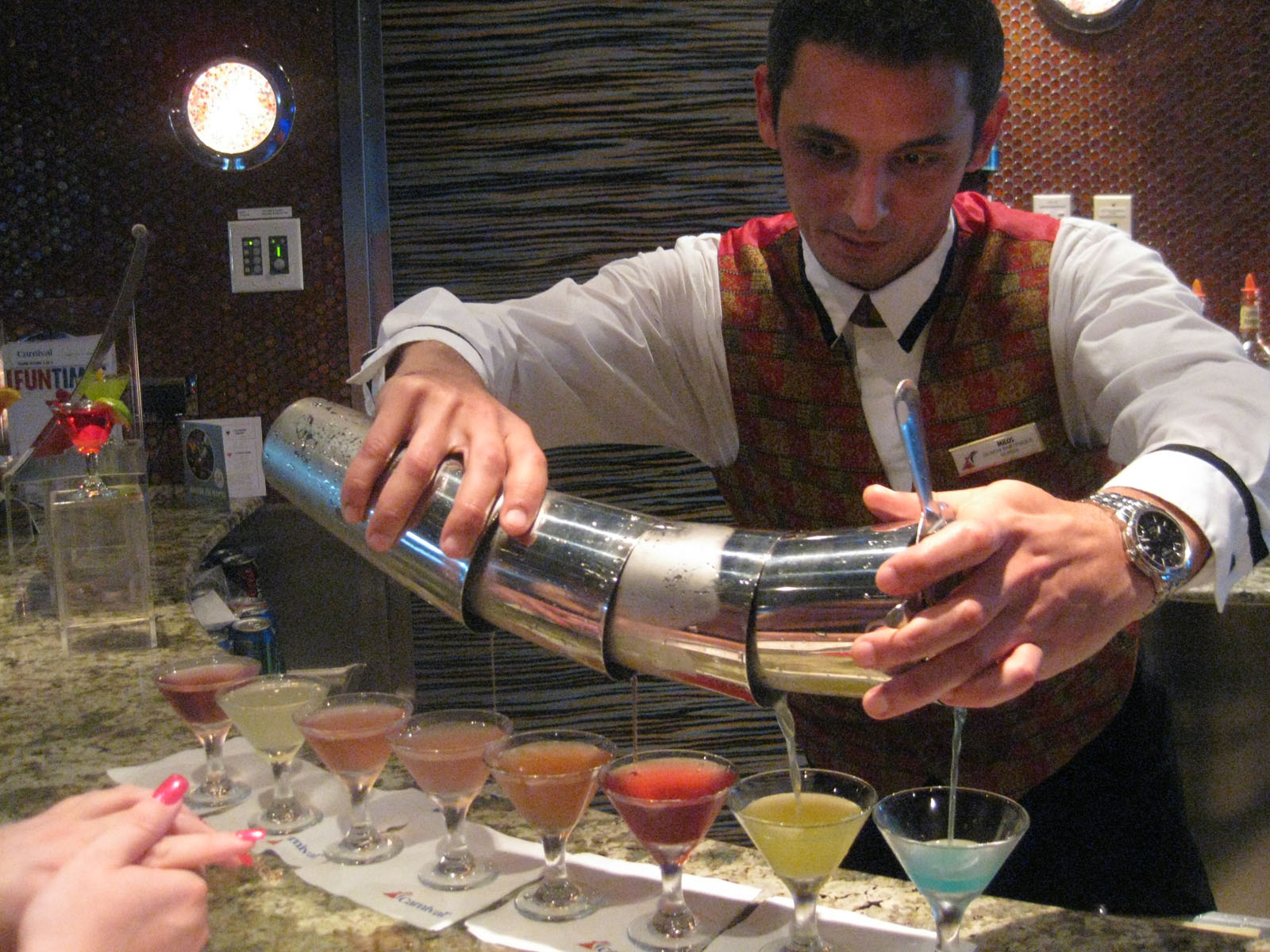 More alcohol! Honestly, neither of us really drink martinis, but this seemed kinda neat anyways and we figured what better way to find out if we like martinis than by drinking eight of them in one sitting?! Our bartender was amazing, as dully noted in the photo below as he pours four different drinks at the same time! They are mini glasses, mind you, and we each had about half of each one, which we figured worked out to about two full-sized drinks a piece, but I myself was still a bit tipsy making my way to the dining room after that! I think my own personal favorites were the Spicy Chipolte, followed by the Sea Blue, which should be numbers 2 & 8 in the picture below…