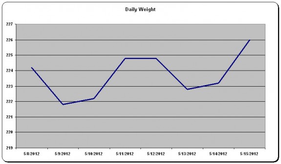 Normally I weigh in on Tuesday mornings, whereas my wife weighs herself every single day. She says that she prefers the daily check-ins because it gives her a better sense of how she’s doing throughout the week, whereas traditionally I’ve always preferred to keep it to once a week because the slight fluctuations tend to drive me nuts. That said, just out of random curiosity, I thought I’d try it her way for the last week and see what I thought of it…