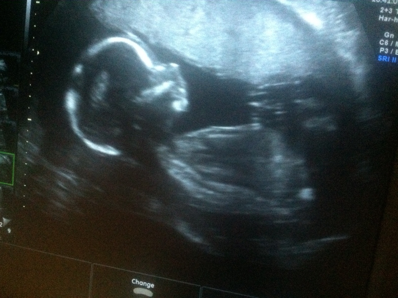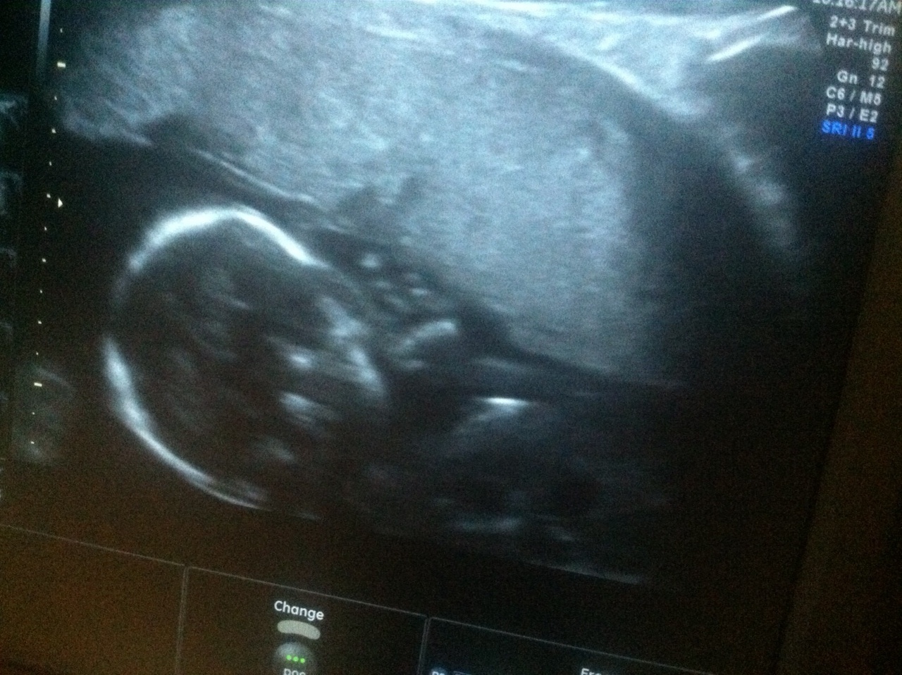 It took an extra day to work out the logistics of today’s appointment, but this morning went in for our first high risk ultrasound, and not only everything check out a-ok, but it was actually pretty cool! Unfortunately we didn’t get a ton of good pictures – just a few that the technician let me photograph off the ultrasound machine when we were done – but it was really neat to watch this more in depth inspection as she took measurements of our baby boy pretty much from head to toe, took a few glimpses of the blood flow through the umbilical cord, looked at the spine to make sure that it was straight and intact, and even showed us the two halves of his developing brain. 🙂