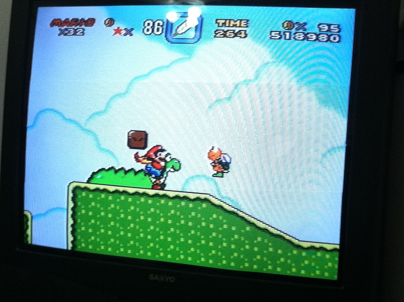 I made it as far as the Butter Bridge before calling it a night tonight, which is pretty impressive in my book! I remember when Super Mario World first came out with the launch of the SNES back in 1991 – Super Mario Bros 3 had blown us away not too long prior, and yet this newest version introduced Yoshi and save points and secret levels … I actually recall getting in trouble playing this game at Walmart – I’d only been playing for, like, two minutes and there was somebody behind me, and a sales guy came by and told me, “If you don’t let other people play, I’m going to turn it off.”
