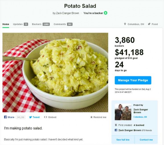 Man Creates a Kickstarter to Make Delicious Potato Salad Posted on July 8, 2014 by Scott / 0 Comment This is brilliant and I hope this guy makes some truly amazing potato salad! food, funny, internet