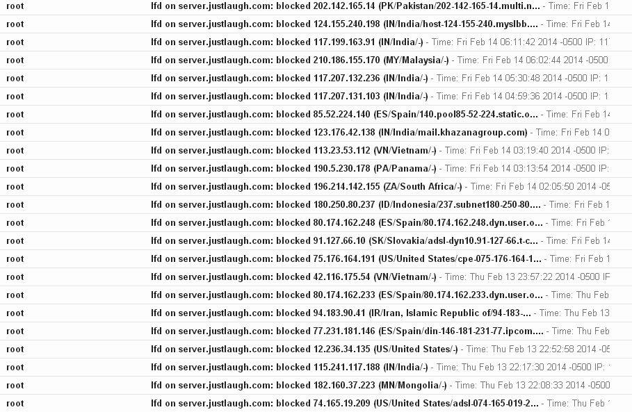 Apparently there was an update to the Login Failure Daemon (lfd) earlier this week that played with the settings for when you get notifications for brute force attacks and whatnot. Mind you, these are happening all the time and no doubt still took place in troves before the update … and yet it still doesn’t make it any creepier to see these things flying through by the dozens, even though they’re all just automated scripts poking around randomly for exploits wherever they can find them.